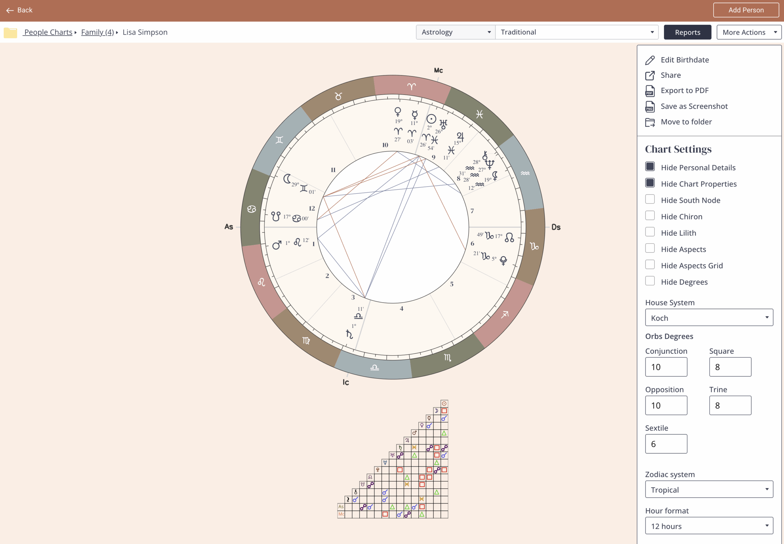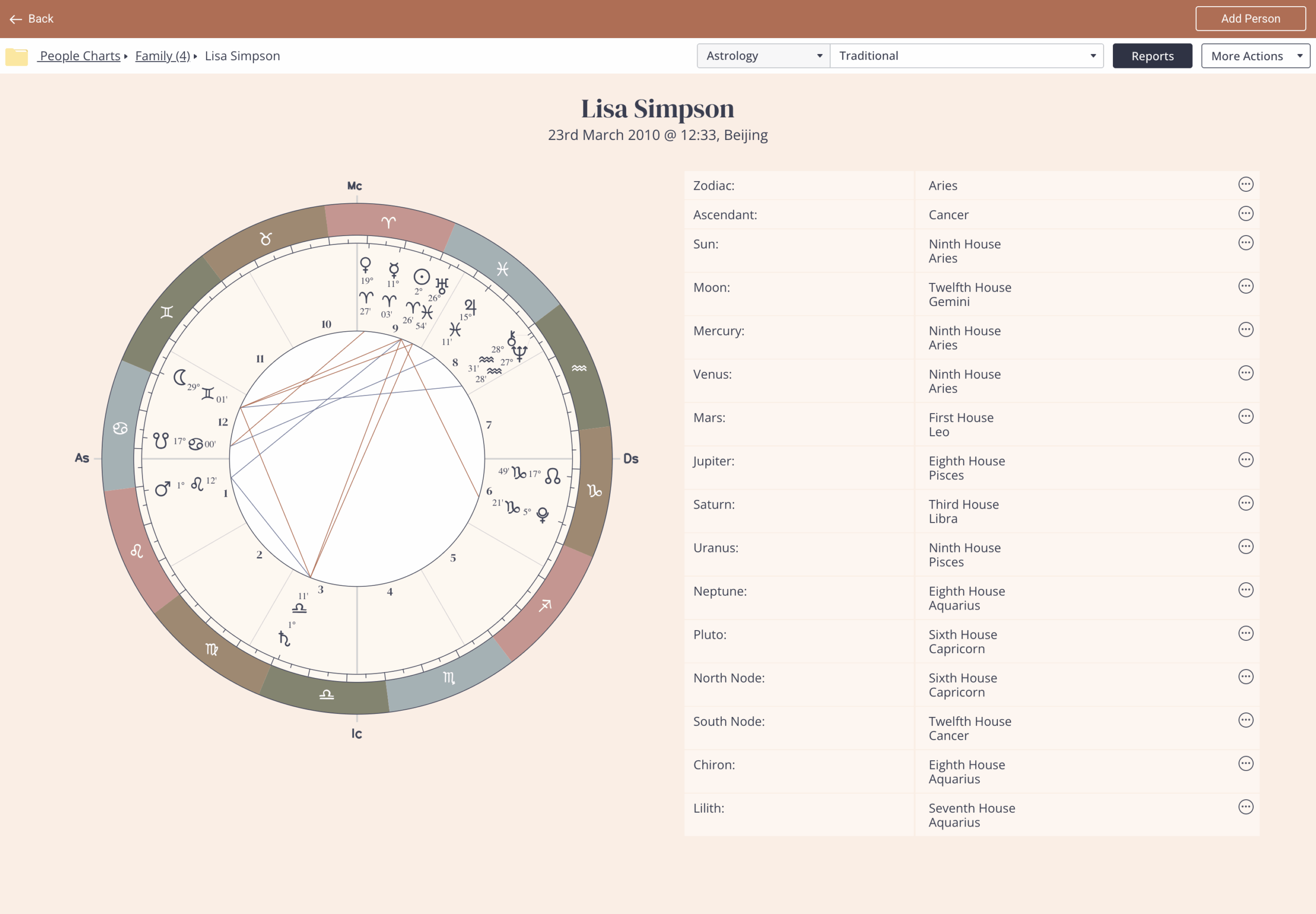 Whole Sign, Placidus, Porphyry, Koch, Campanus, Alcabitius, Equal, Morinus, Regiomontanus, Sripati, APC, and more.