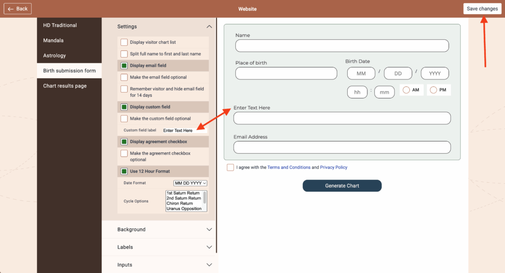 Click on ‘Display custom field’ and then enter your text to name the custom field (ie: Phone Number.) Be sure to ‘Save changes’ once finished.