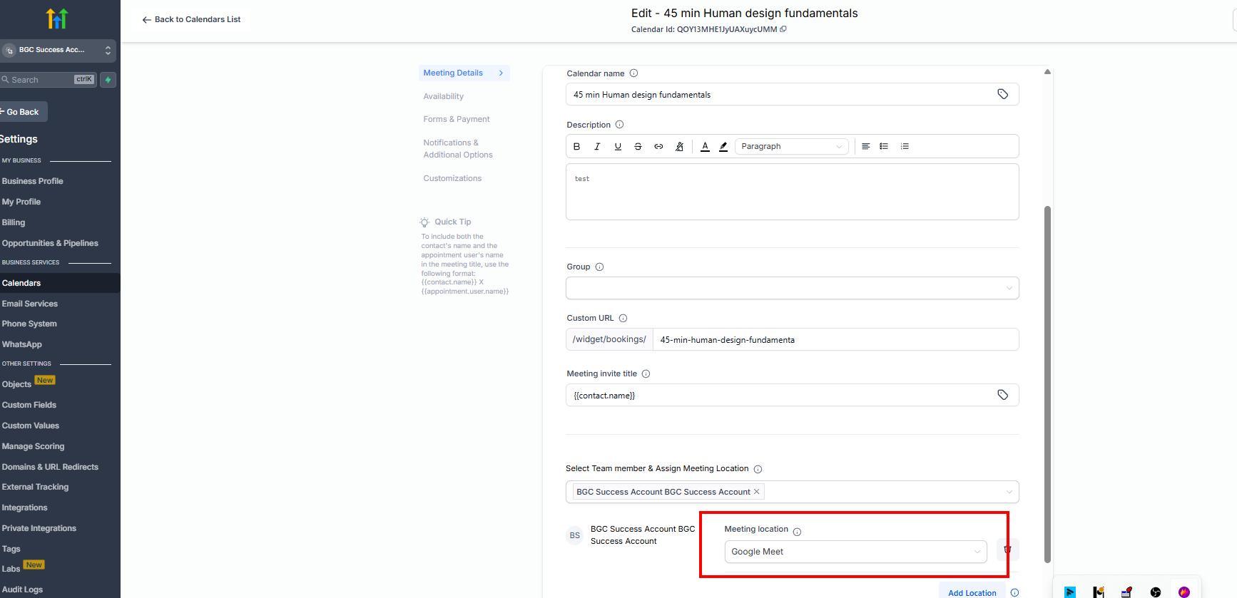 – Important: selecting location you connected meeting platform (that will autogenerate meeting link)