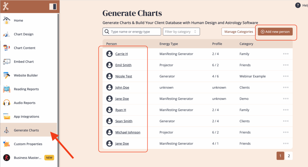 Select ‘Generate Chart‘ from the left menu. Click on a person you have already entered, or click on ‘Add new person’