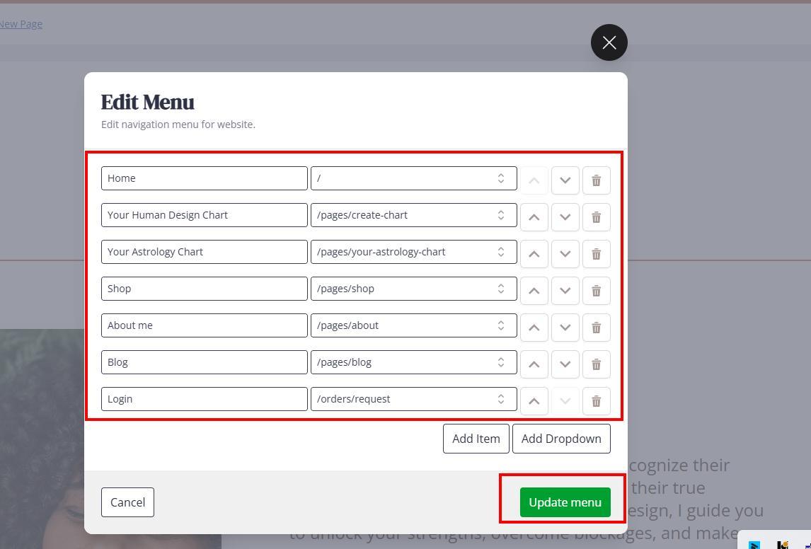 4. Edit Menu elements and press Update menu. You can add menu and sub-menu elements, delete pages (deletes only from menu, not actual page), reorder and rename menu elements. You can link Menu elements with internal Website builder by selecting slug from the dropdown or link menu elements with external pages, e.g. Calendly calendar, where you will need instead slug, paste full URL staring with https://….