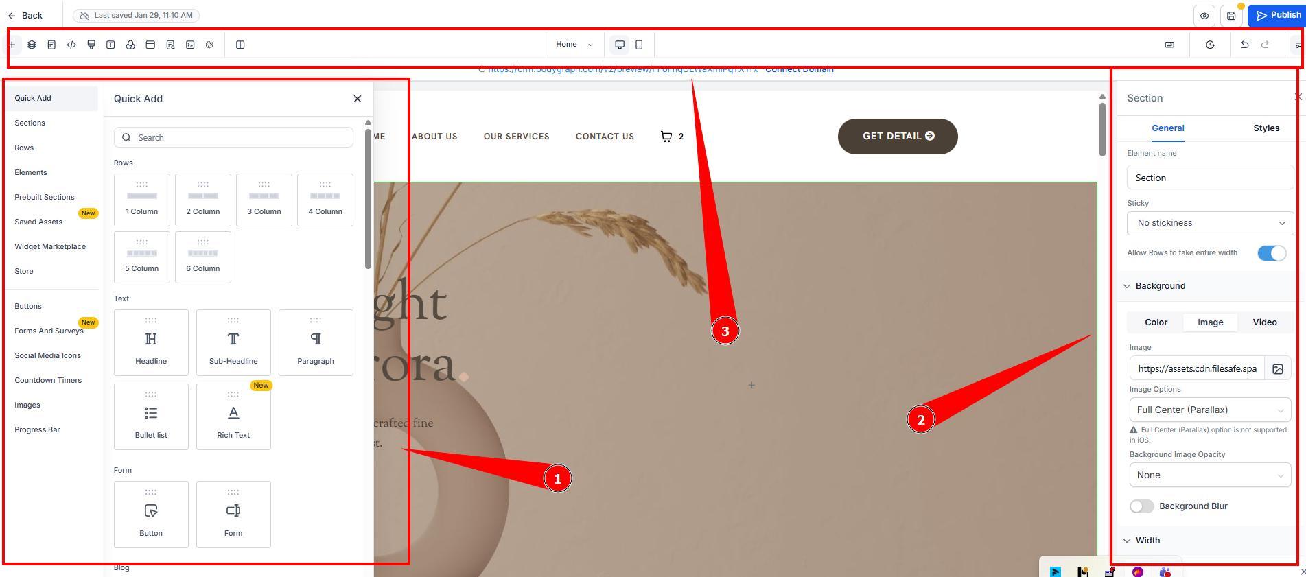 Left panel: sections + elements you can add (drag & drop)