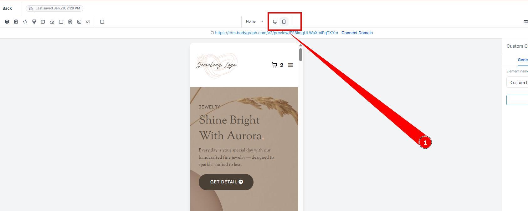 Top bar: save, undo/redo, desktop/mobile preview, and more
