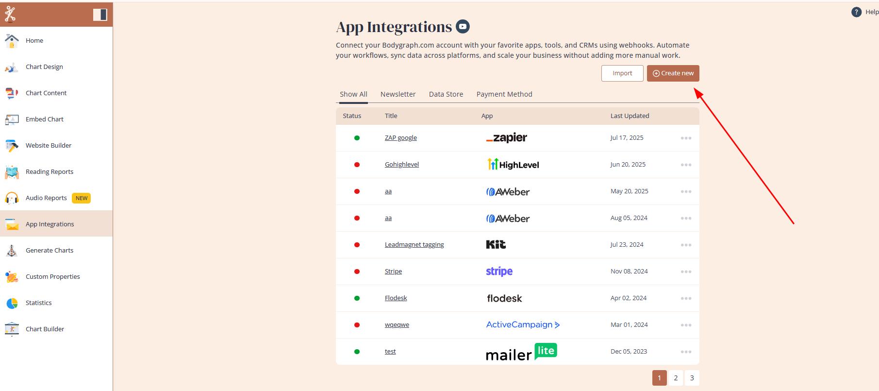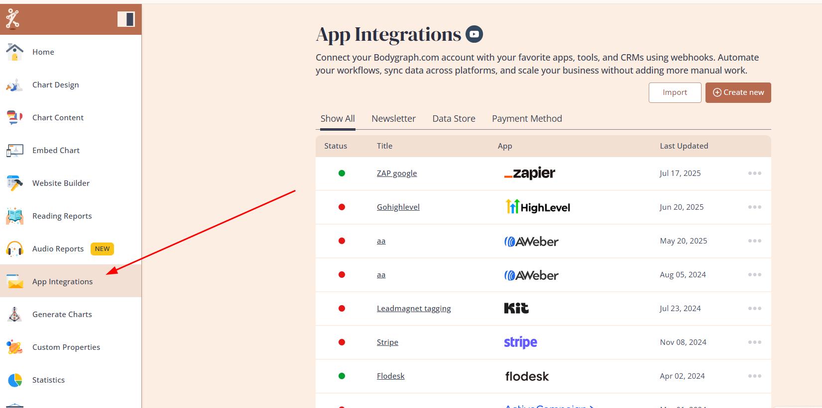 1. Inside your Bodygraph.com dashboard, go to the App integrations section.