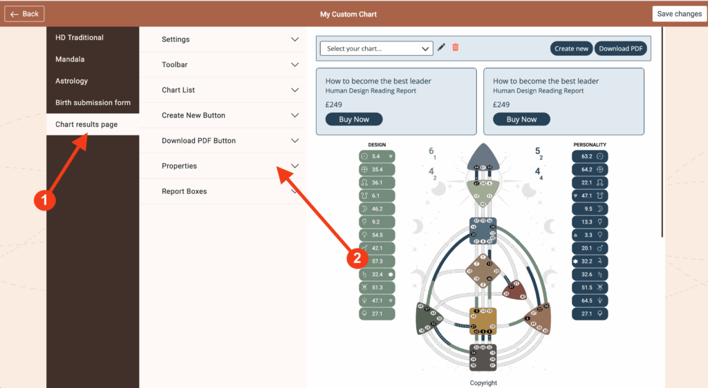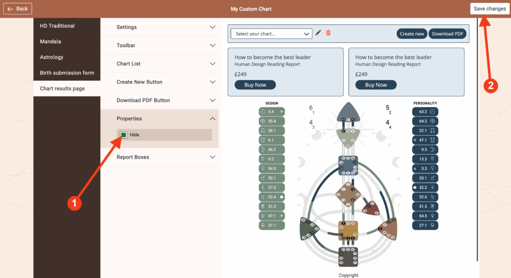 3. Click on ‘Hide’ to hide the properties boxes on the chart results page, then click ‘Save changes’