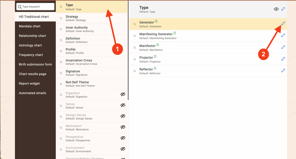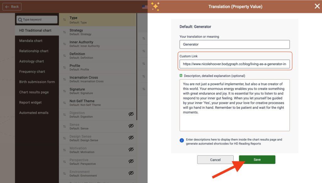 You can convert property labels into clickable links on the chart result page, enhancing user engagement and promoting related services or products. For instance, you could link to home scents tailored to specific Human Design properties (e.g., calming scents for not self anger, frustration, etc.). Or you can redirect customers to your scheduling calendar for 1:1 sessions. This innovative feature allows you to offer targeted products, thereby adding value to your chart results and potentially increasing sales.