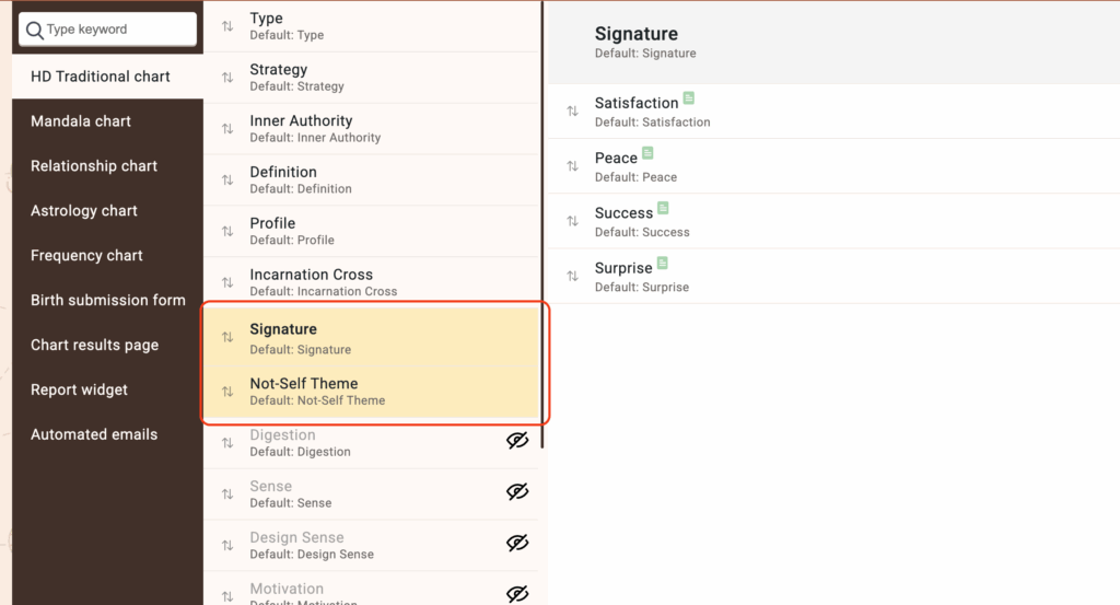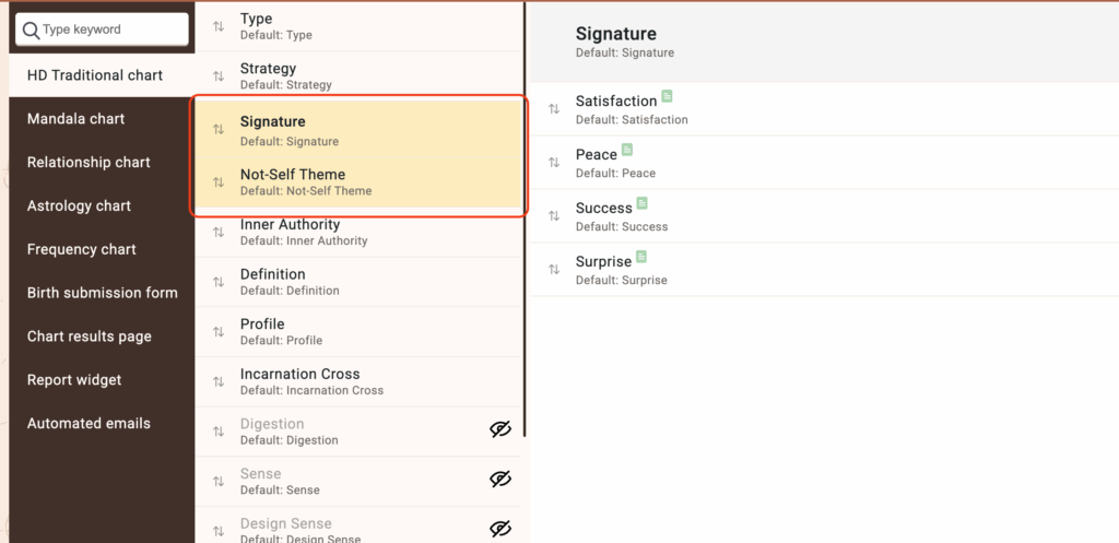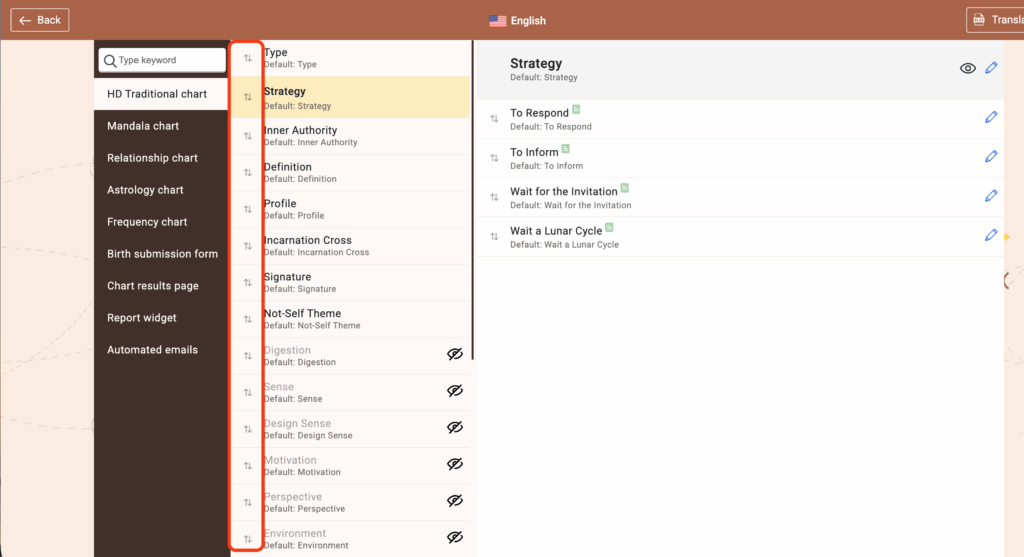 To change Human Design properties order at the chart result page please follow the steps listed below: