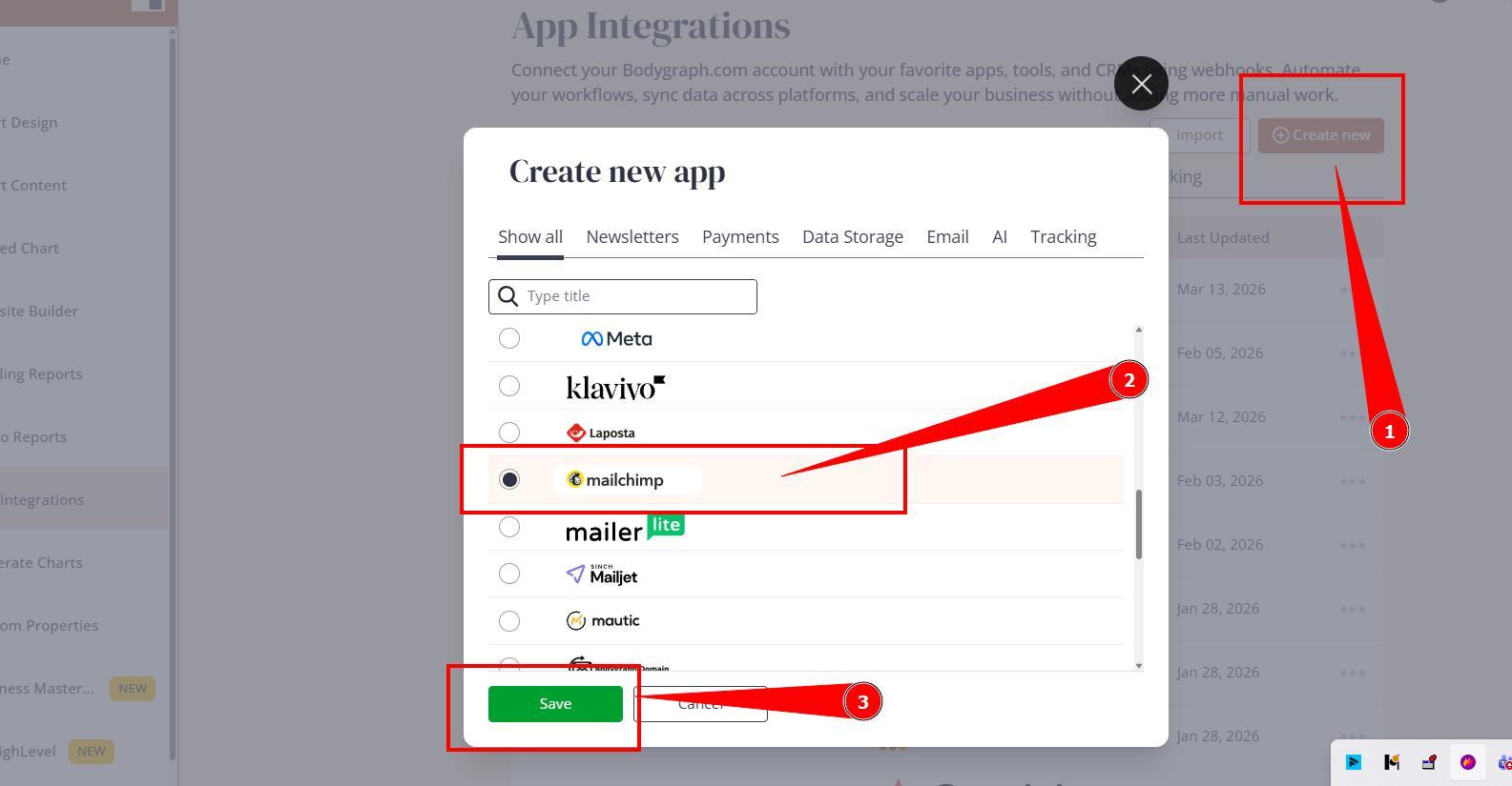 2. Press ‘Create new’ button and select MailChimp app from the following options, then click ‘Save’.