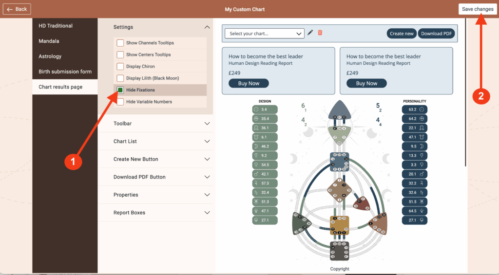 To hide fixations in the Human Design Chart on your website, proceed as follows: