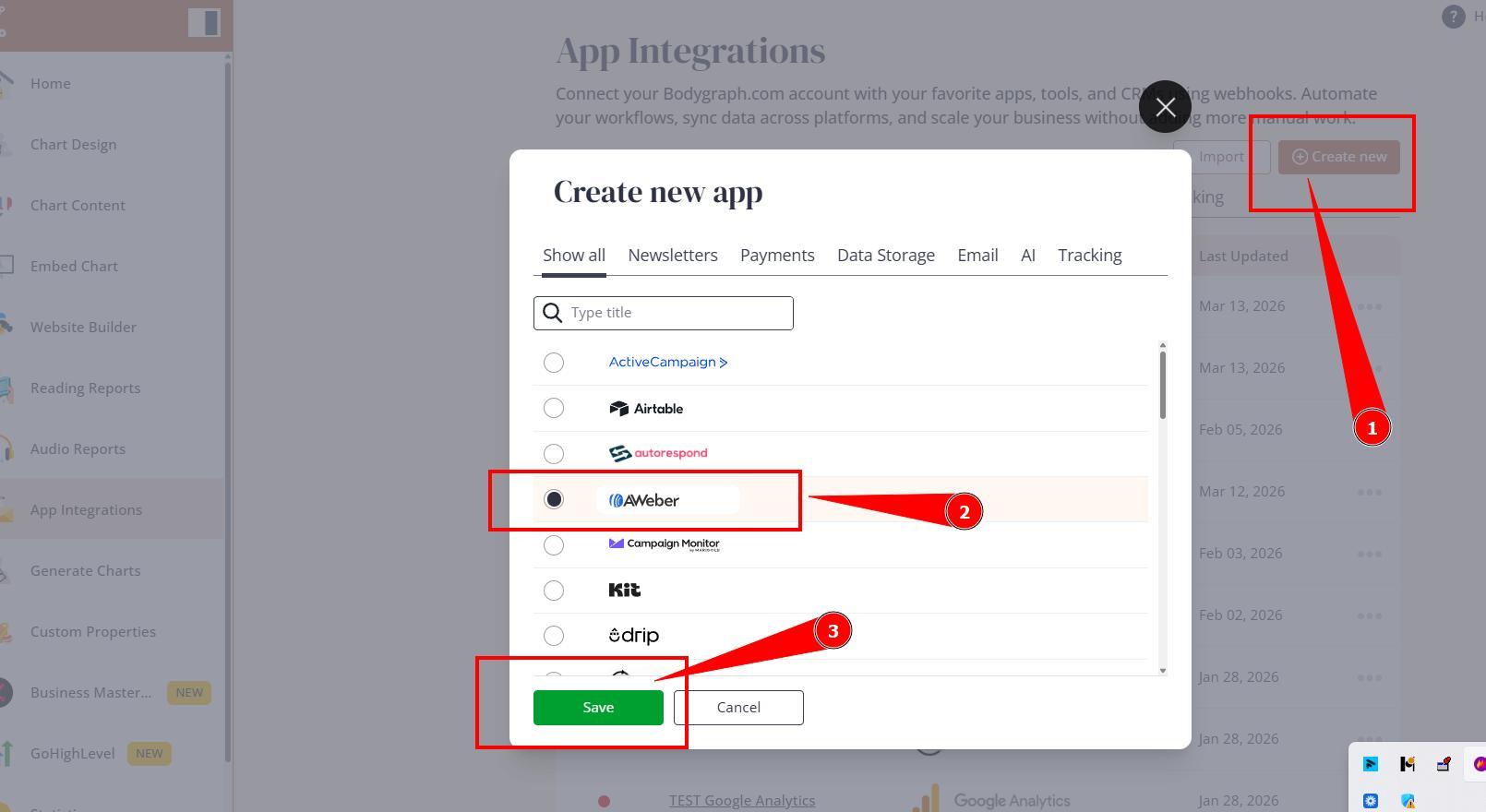 2. Press ‘Create new’ button and select Aweber (AW) app from the following options, then click ‘Save’.