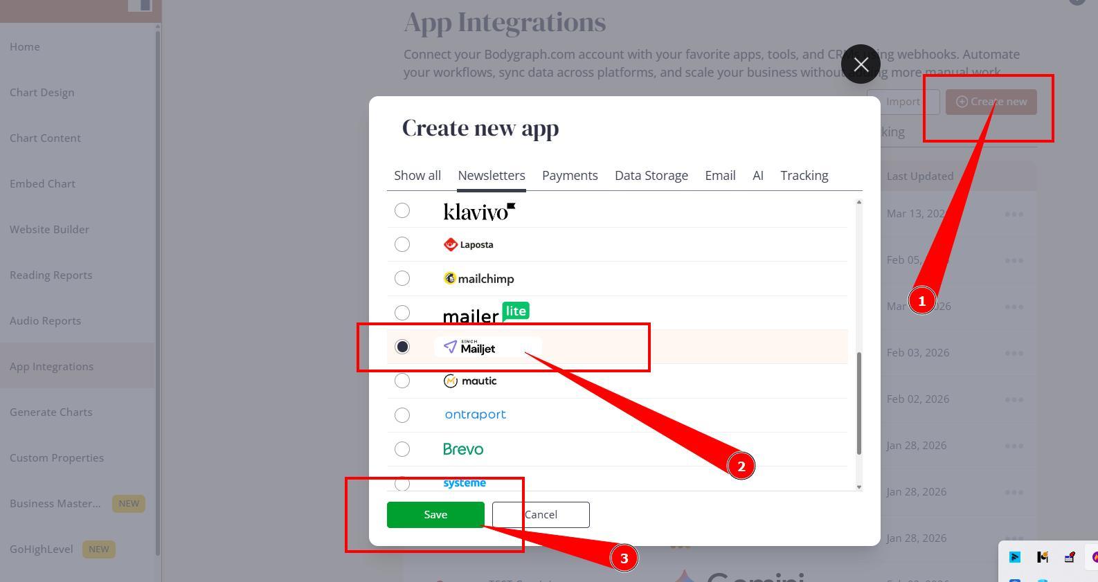 2. Press ‘Create new’ button and select Mailjet app from the following options, then click ‘Save’.