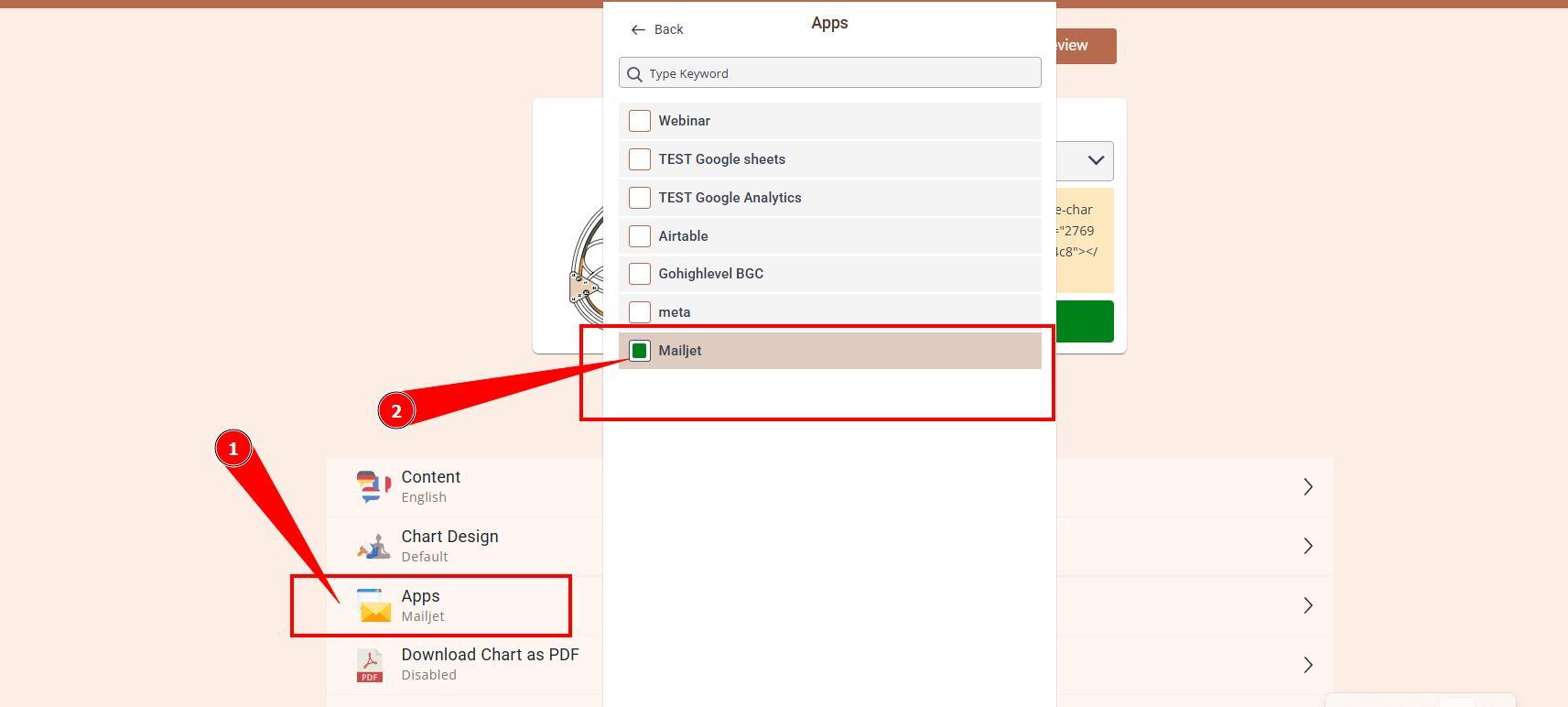 9. Go back to Bodygraph.com account, then to Embed chart, select the embed code that you are using/will use on your website and enable Mailjet app.