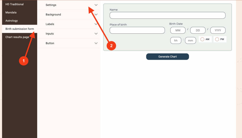 2. Click on ‘Birth submission form’ and then click on ‘Settings’ to expand the menu