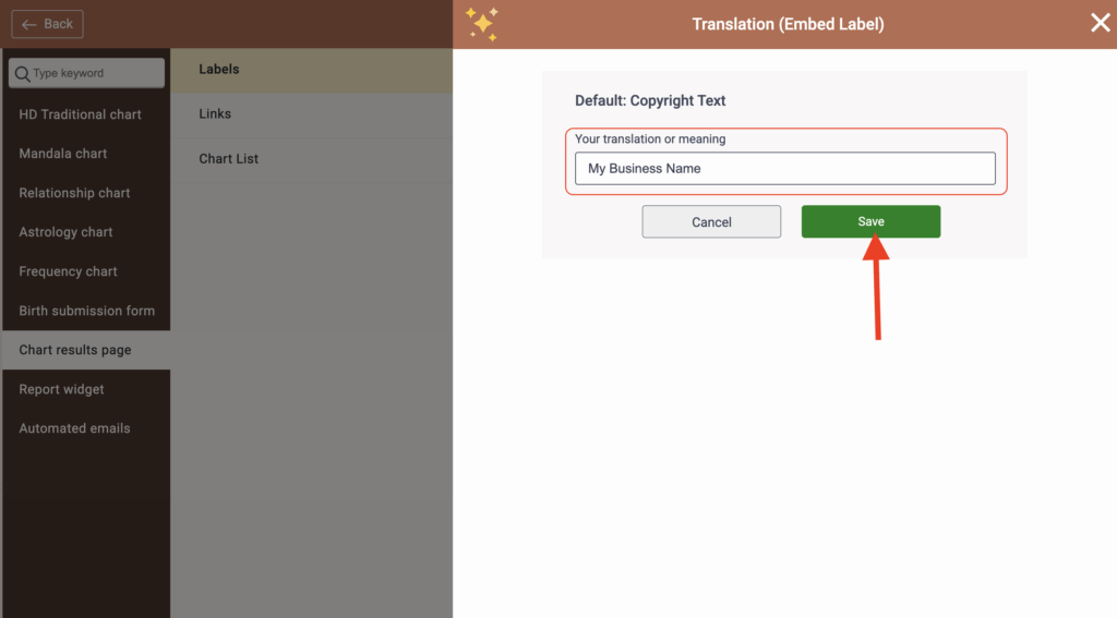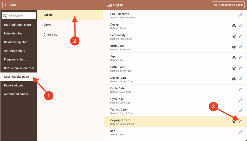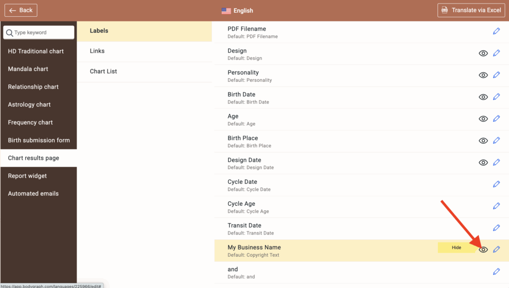 Click on ‘Chart results page’, then click on ‘Labels’, then click on the pencil icon