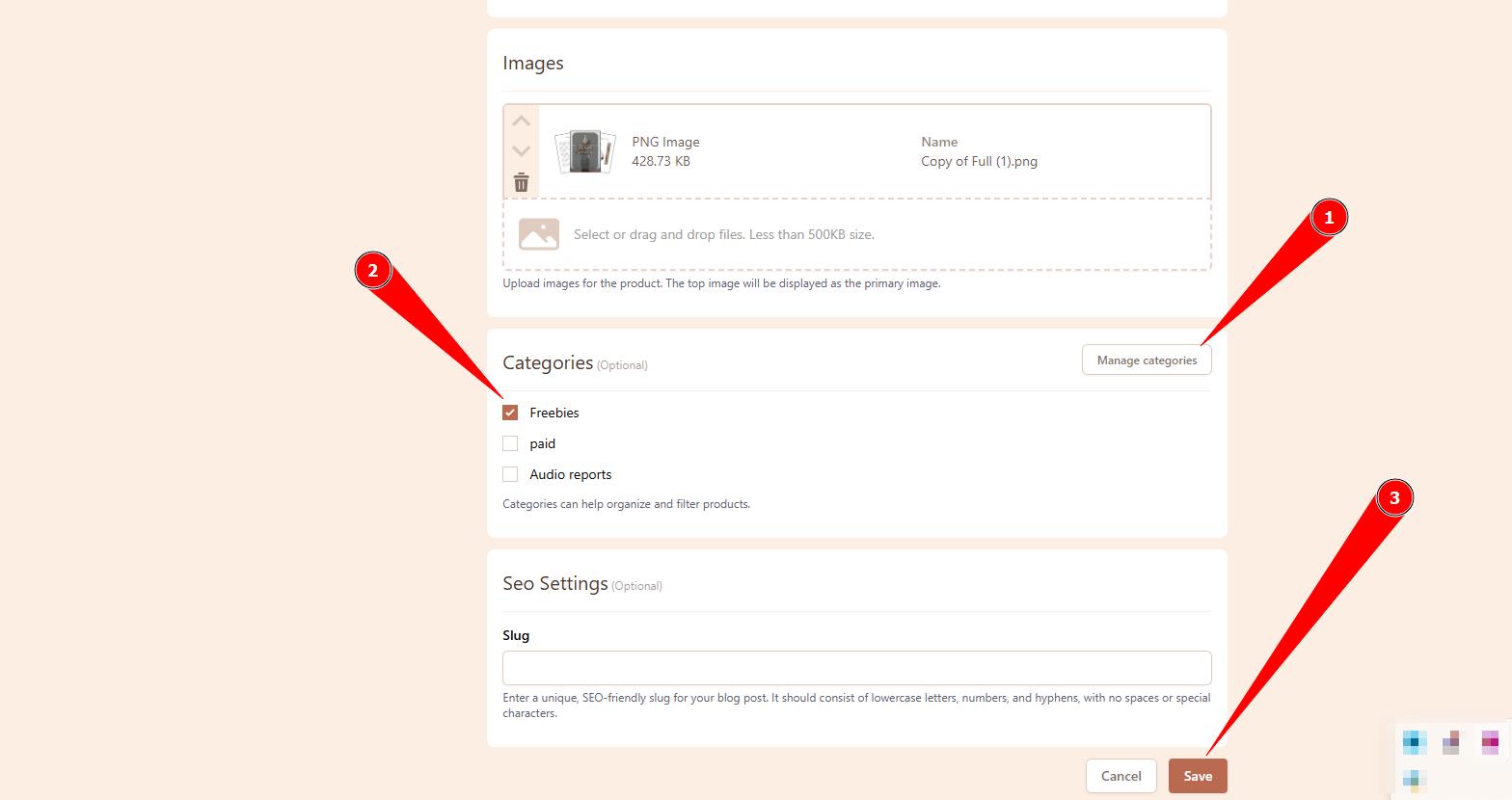 4. Click +New Product, link your audio report at the drop down. Also add descriptions, images, create and assign Category and click Save.