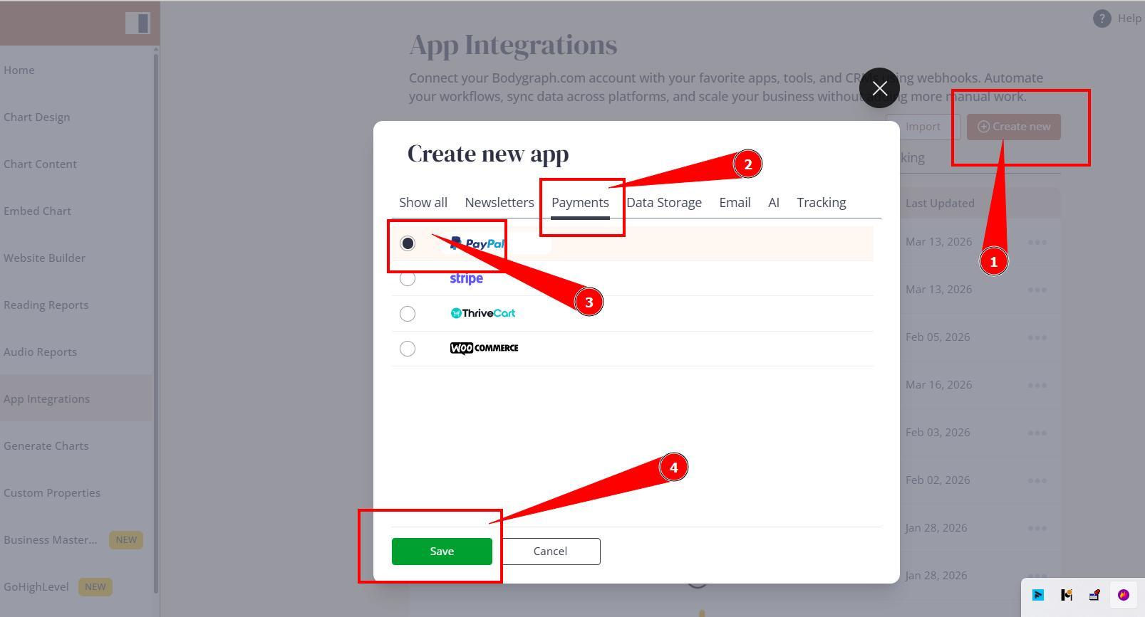 Click Create new button, select Payment tab, toggle on PayPal option and click ‘Save’.