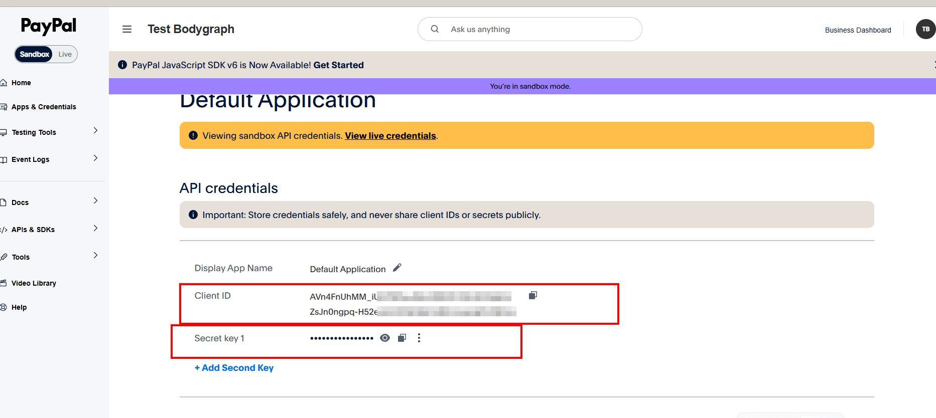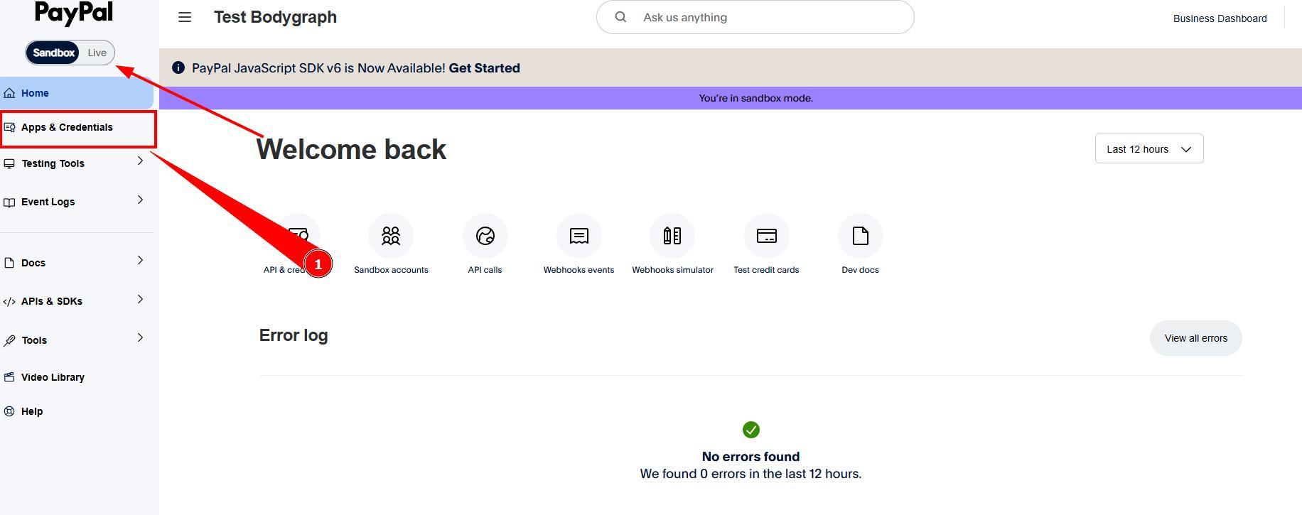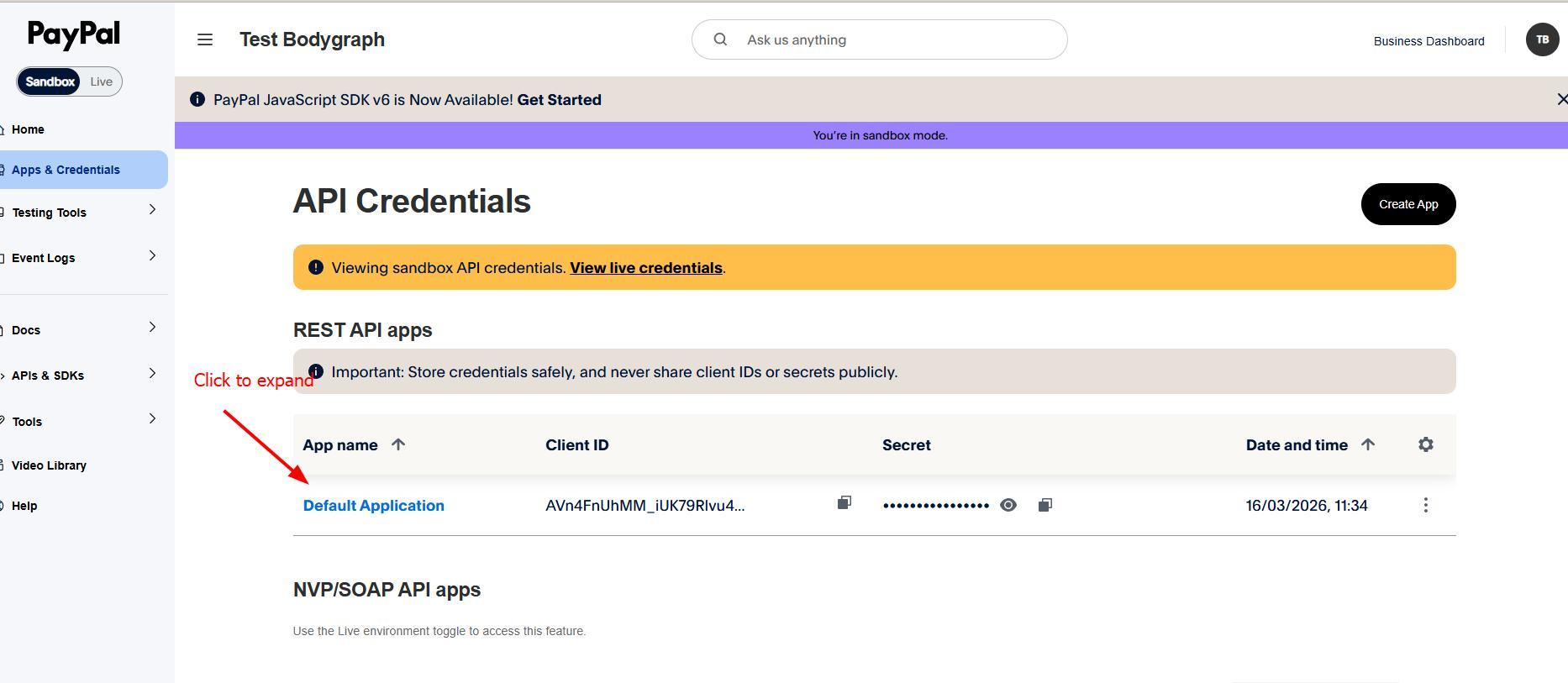 This is where you can switch between Sandbox (test) and Live modes. If you have other active sales and Paypal is in use, then we do not recommend swithcing test mode on. Click on Apps &Credentials.