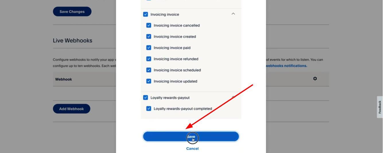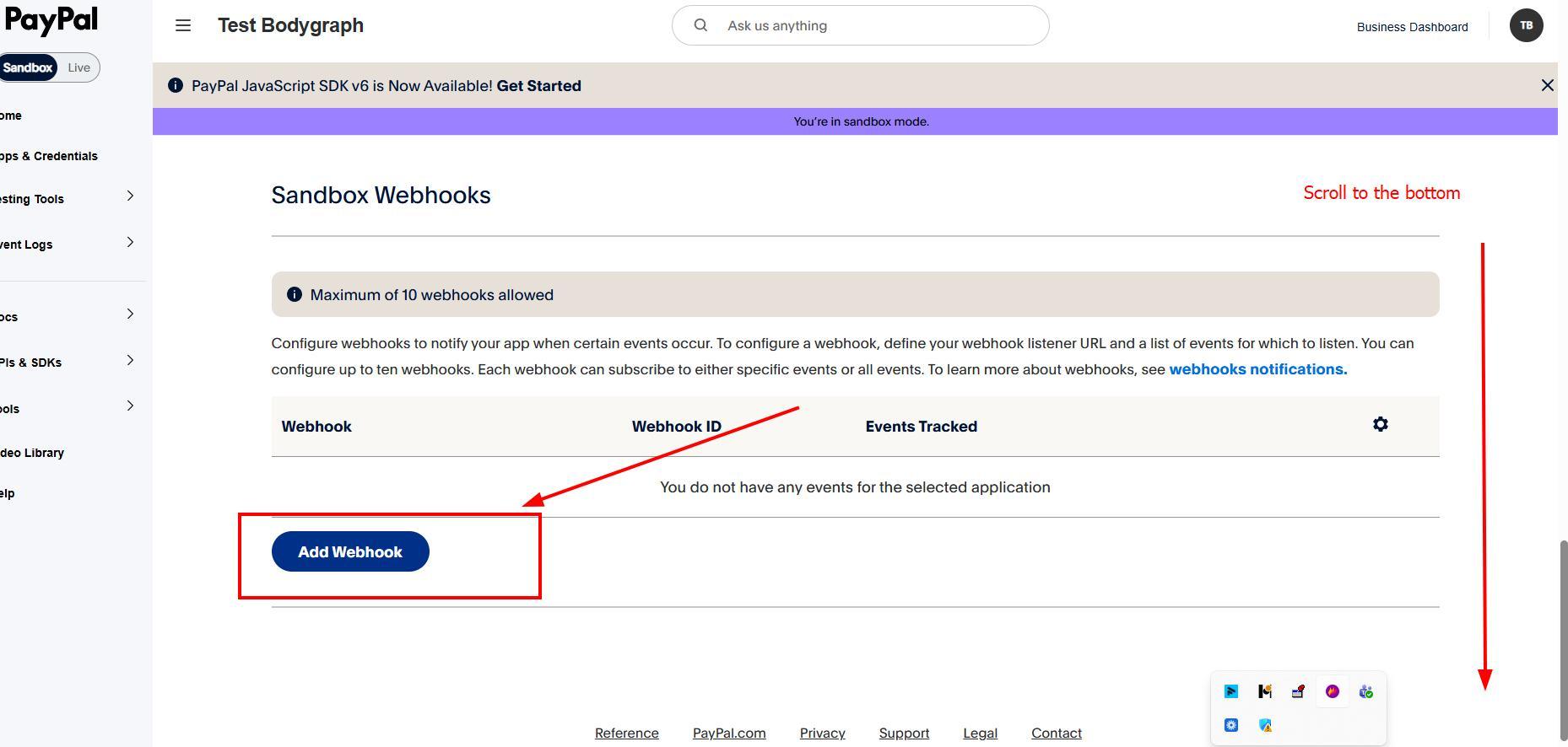 Go back to Paypal where you copied credentials, scroll down and click on Add Webhook. Make sure you do this under the correct Client ID if you have multiple created.