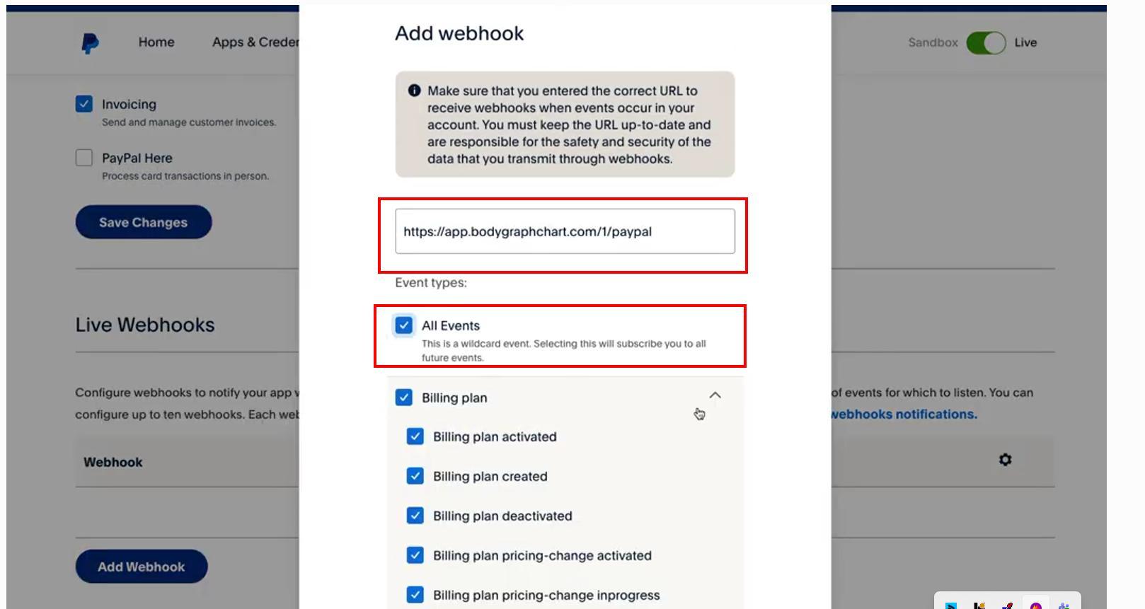 Copy Webhook URL and go back to PayPal account tab.