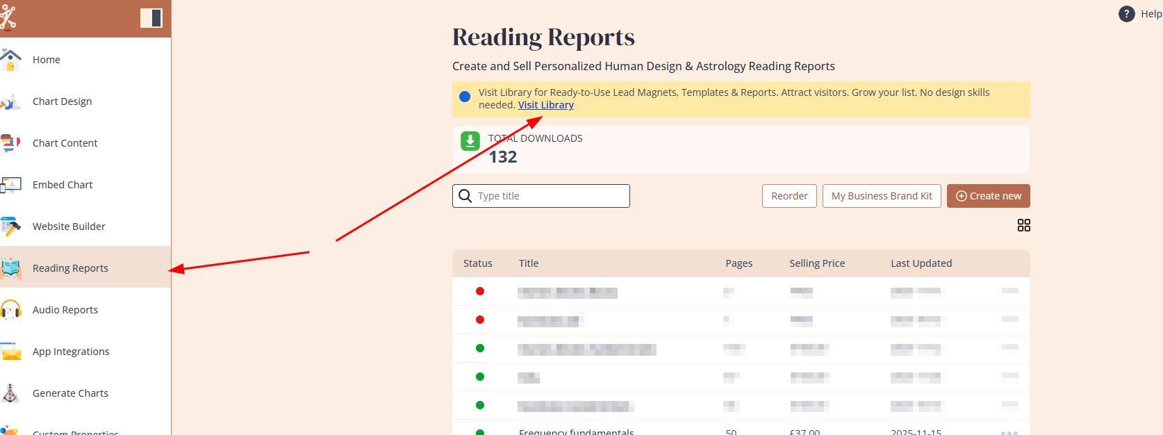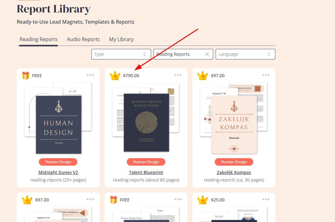 Premium reports are ready-made Human Design and Astrology reports that you can purchase and use in your business. They are typically marked by a little crowns symbol at the templates dashboard at your Reading reports tool.