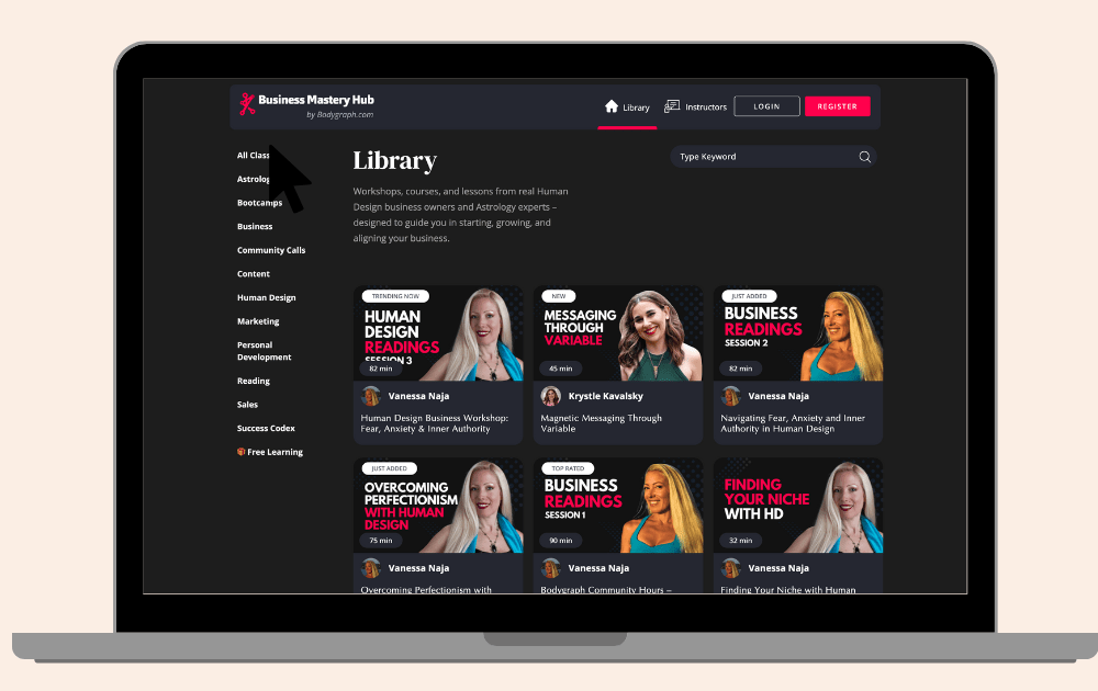 Get access to a full library of step-by-step business courses that show you how to launch, grow, and scale a Human Design or Astrology business. Learn marketing, sales, funnels, offer creation, and client onboarding with simple, practical lessons you can use right away.