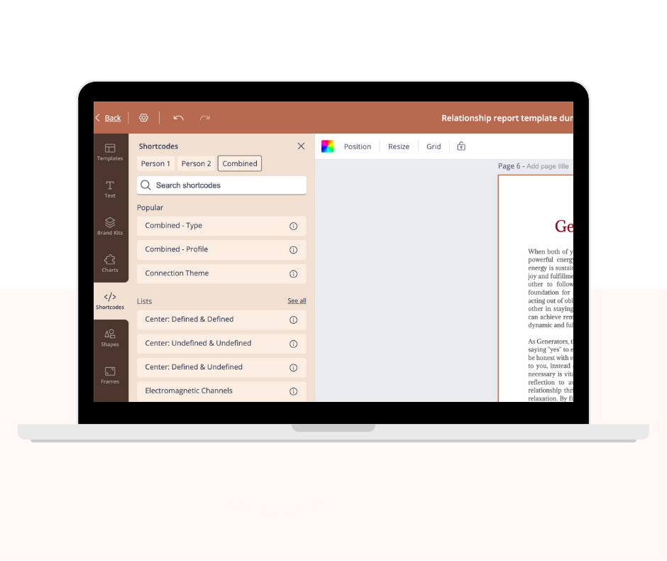 We’ve done the hard work for you! The Bodygraph.com Relationship Report Tool comes with a pre-built template, including all pages and placeholder text. No need to map Human Design Relationship properties—just replace the dummy text with your unique insights and start selling instantly!